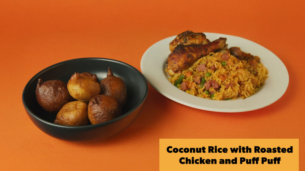Coconut Rice with Roasted Chicken and Puff Puff